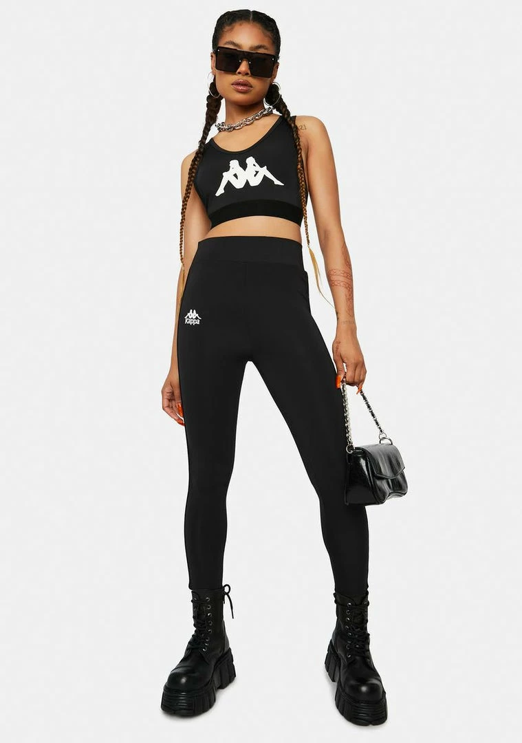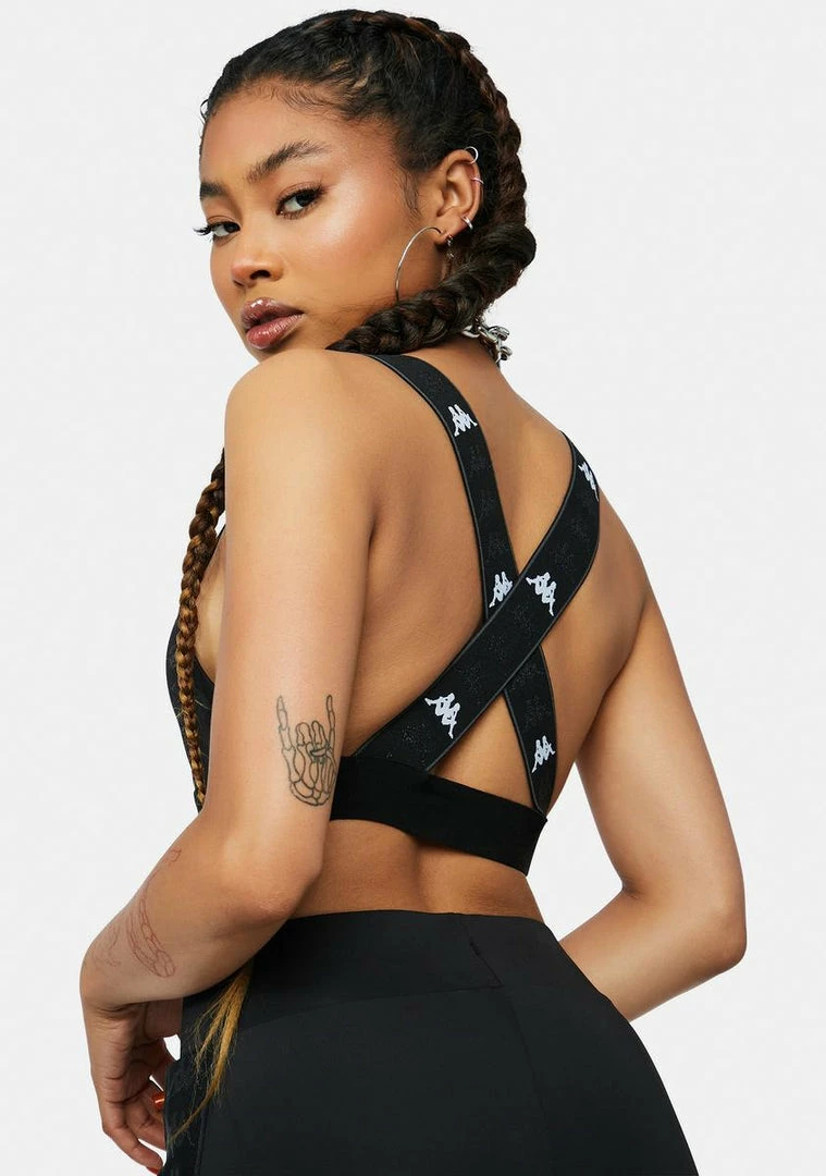 features a stretchy spandex fit, criss cross back straps with subtle piping and the kappa logo all over, and a larger logo printed on the front.