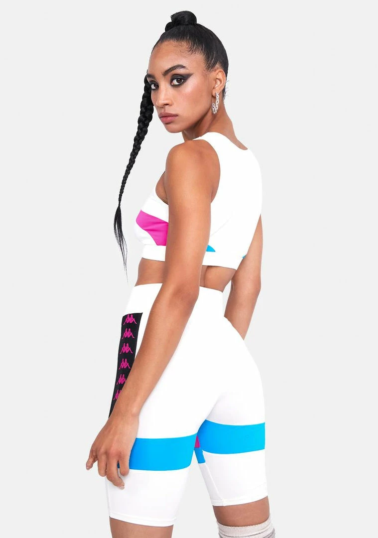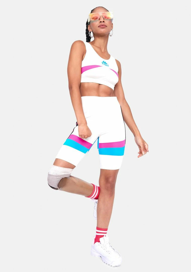 cuz the hustle never ends. These sporty high waist bike shorts have a thick elastic waistband, a striped colorblock design, and jacquard logo tape down the sides.