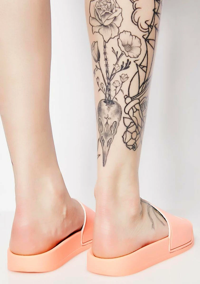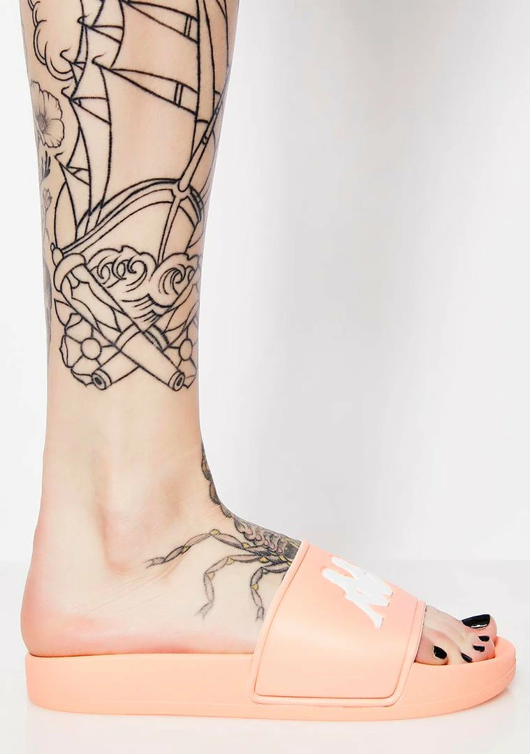 got ya ready to go. Keep it simple in these peachy pink slides that have comfy footbeds and white brand logos on top.