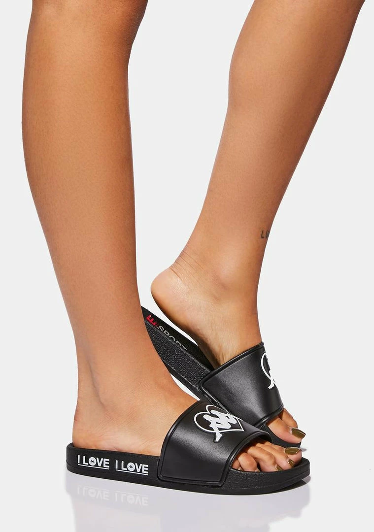 feature a PVC construction, thick straps across the feet with debossed Omini Kappa logos, cushioned footbeds, and a slip on fit.