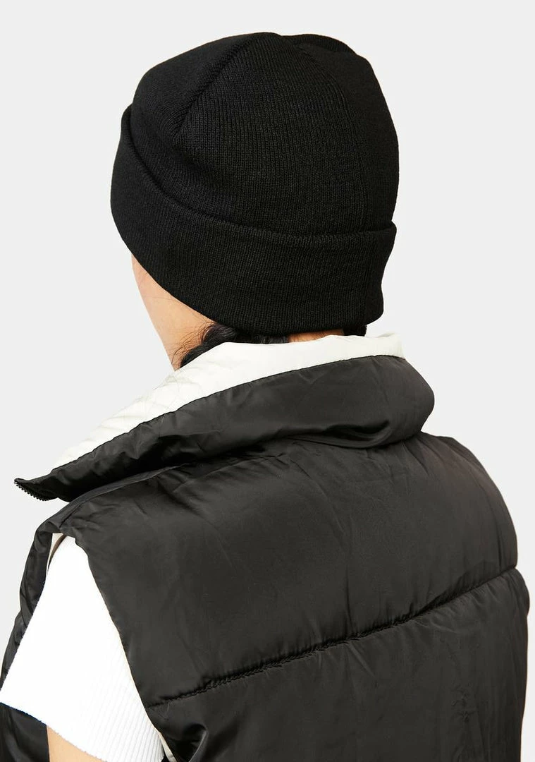 has a ribbed knit construction, a fold over hem and embroidered branding across the front.