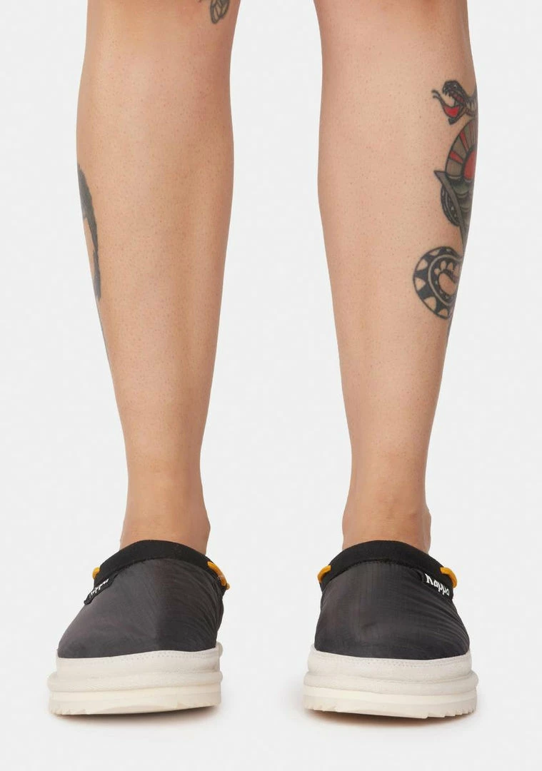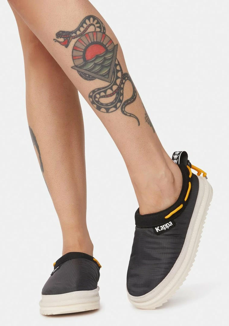 has a slip on fit, drawstring accents on the heels, brand logo tags, and rubber soles.