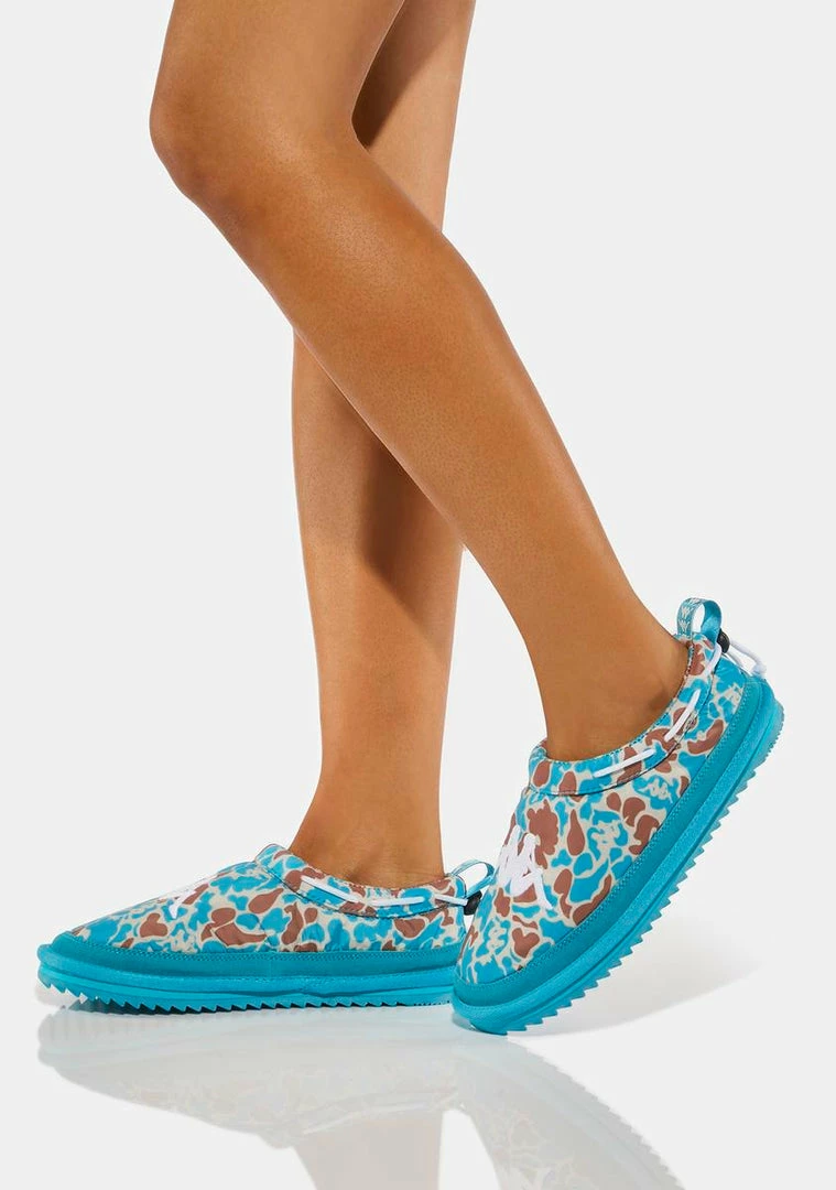 have a slip on fit, drawstring accents on the heels, brand logo tags, a graphic print, and rubber soles.