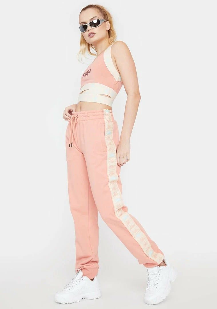 features a jersey stretch, Kappa lettering printed across the chest, and crisscross elastic tape.