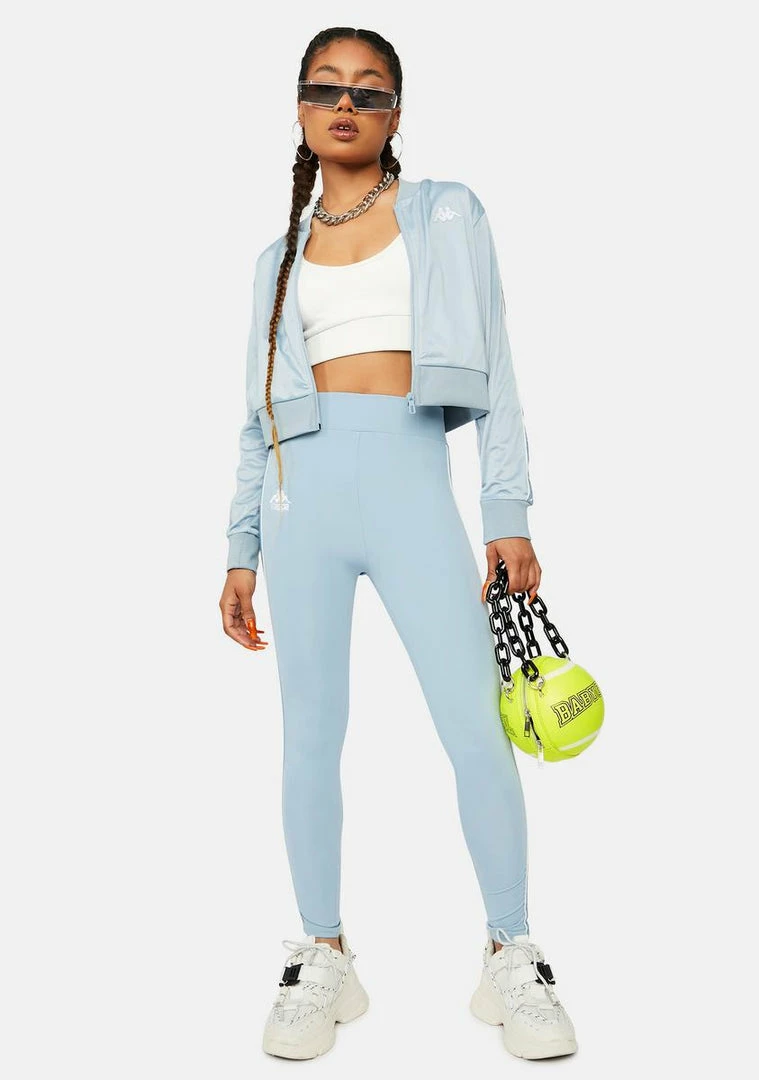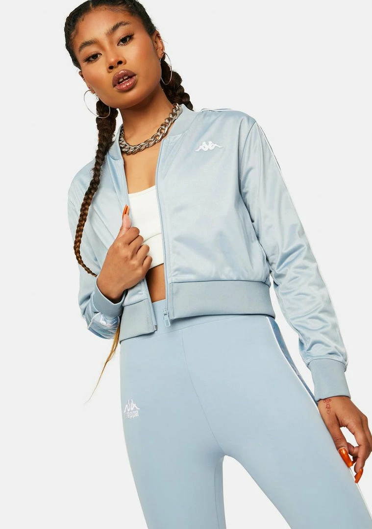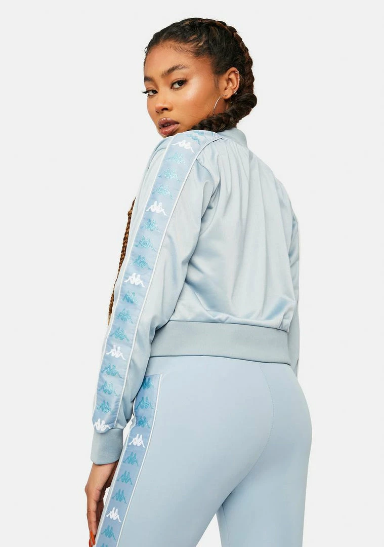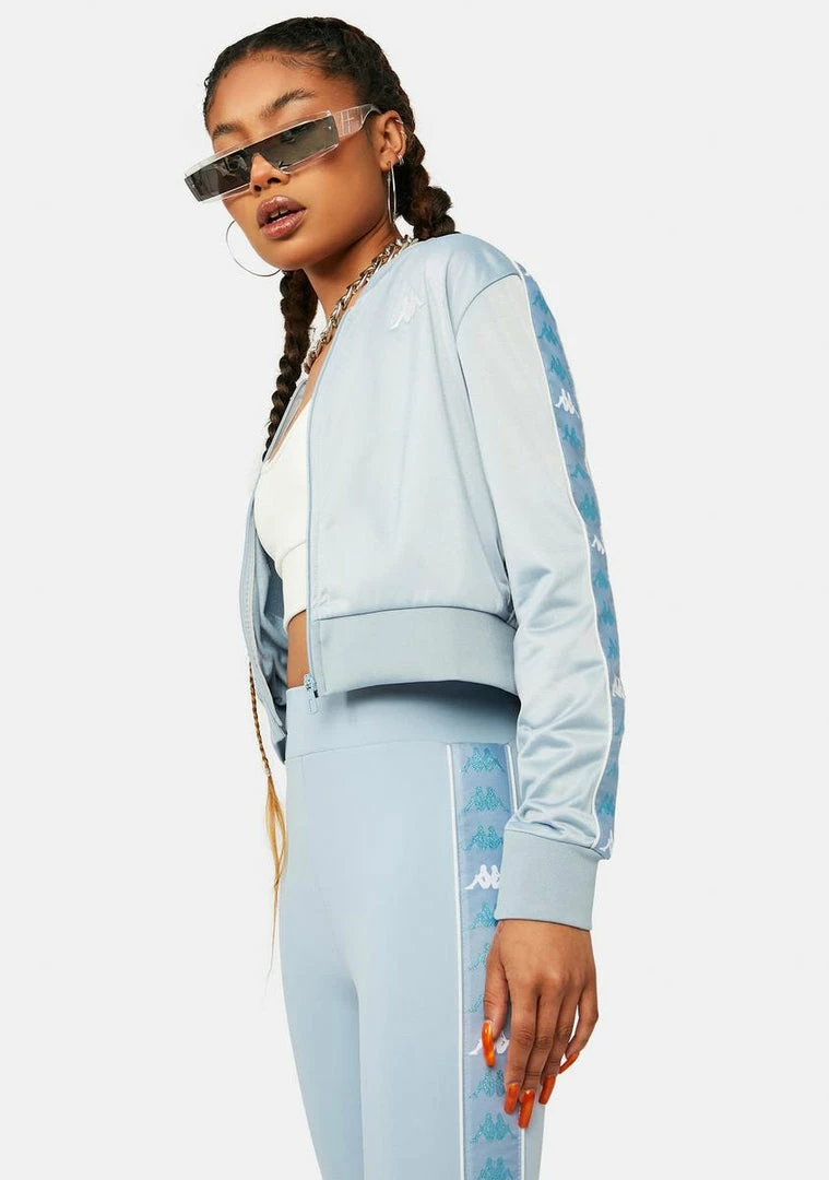 features a ribbed knit trim at the hem, cuffs, and collar, a front zip closure, cropped fit, and a subtle piping detail with the kappa logo up both sleeves.