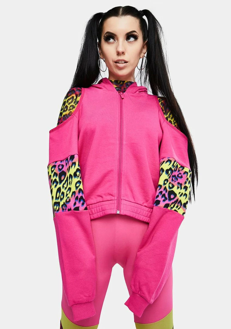 cuz you always stick the landing. This sporty zip up hoodie has a soft fleece lined construction, cold shoulder cutouts, retro color blocking, and logo graphics on the back.